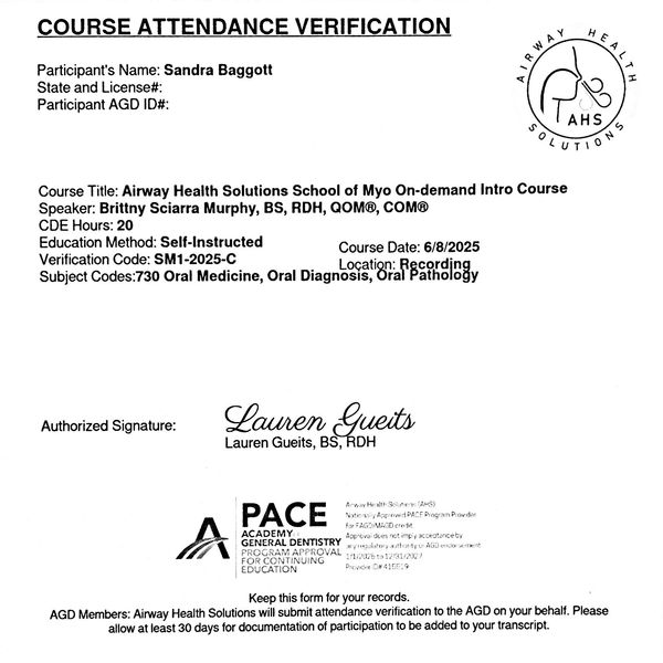 I have completed Airway Health Solutions School of Myo Course and have continued to build and develop my knowledge of Myofunctional Therapy.
