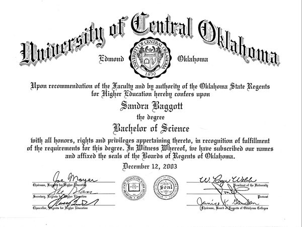 I attended the University of Central Oklahoma in Edmond, Oklahoma and earned a Bachelor's Degree of Science.