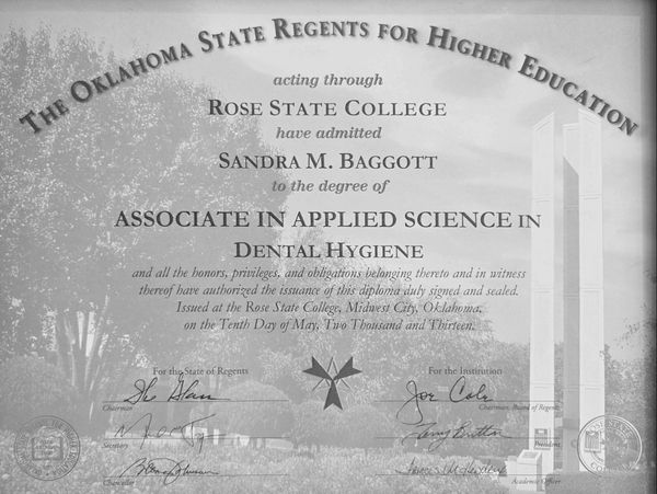 I attended Rose State College in Midwest City, Oklahoma and earned an Associate's Degree in Applied Science in Dental Hygiene.